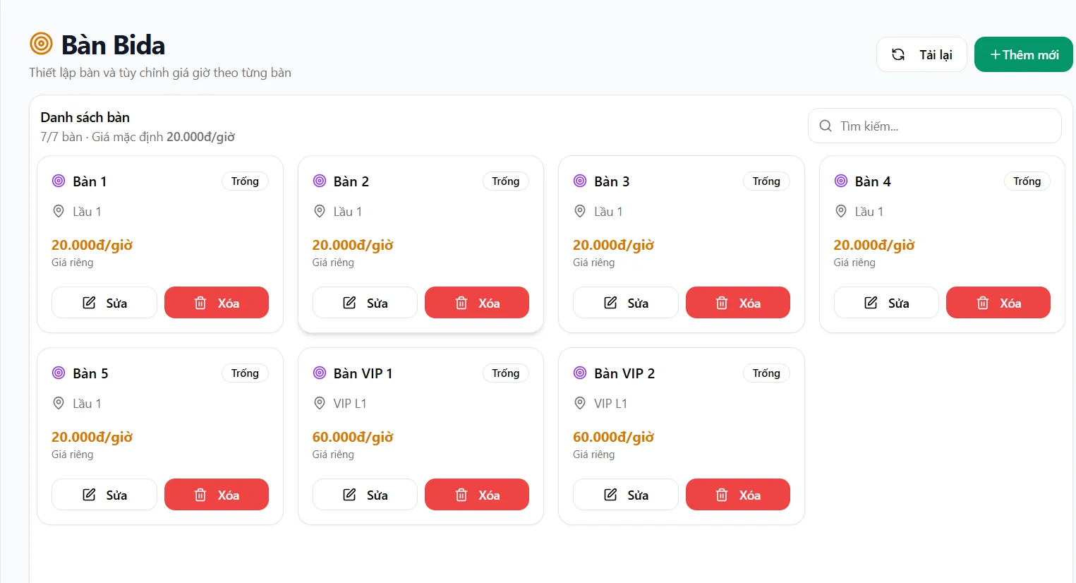 - Quản lý trạng thái bàn (đang chơi, trống)